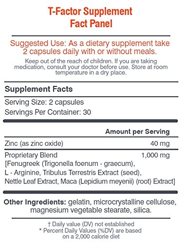 -. Feature : BUILD LEAN MUSCLE MASS: By naturally raising your levels of free testosterone, T Factor Men improves performance to help sculpt lean muscle. Increase muscle mass & get the results you have been seeking with your regular workouts in the gym. / MAXIMIZE POWER & STAMINA: Freer testosterone in your system provides the extra push you need to perform at your peak during your toughest workout sessions and in the bedroom. Stamina perform with more stamina when you need it most. / BOOST SEX DRIVE & LIBIDO: Ramping up levels of free testosterone is the answer for men who want to pump their libido to new heights. Increase stamina and energy. / ENHANCE PERFORMANCE: T Factor Men delivers mind-blowing performance and natural energy to help you blast through your workouts. You'll perform with more stamina when you need it most. / MAXIMIZE ENDURANCE: L-Arginine increases the body's power, strength, and endurance levels by stimulating the production of Nitric Oxide.