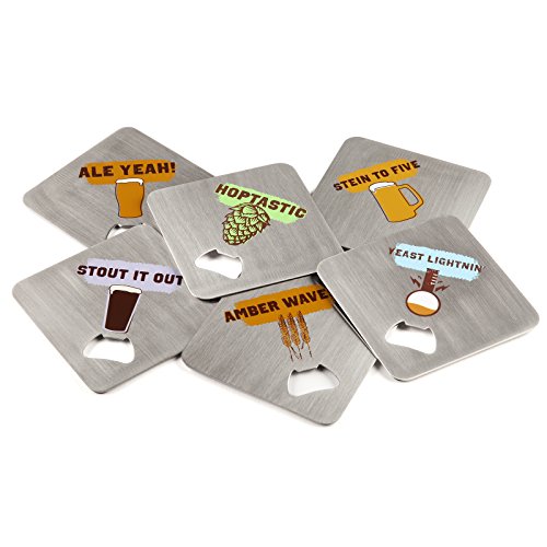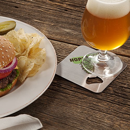 -. Feature : 6 stainless steel Drink coasters / 4x 4Coasters / 4 rubber stoppers to protect surfaces / Built-in bottle openers / Fun craft beer graphics & quotes
