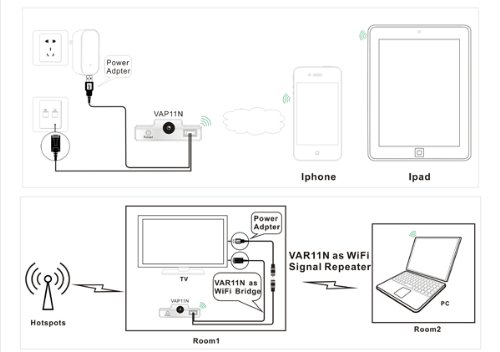 VAP11N is a professional mini wireless WiFi Bridge and WiFi Repeater.Its WiFi relay fuction solve the common question of the traditional wireless signal frequently dropping to insure the stability of the signal.Based on IEEE 802.11N standard,it extends WiFi network range with steady transmission speed up to 150Mbps.It is also compatible with IEEE 802.11B and IEEE 802.11G standard.