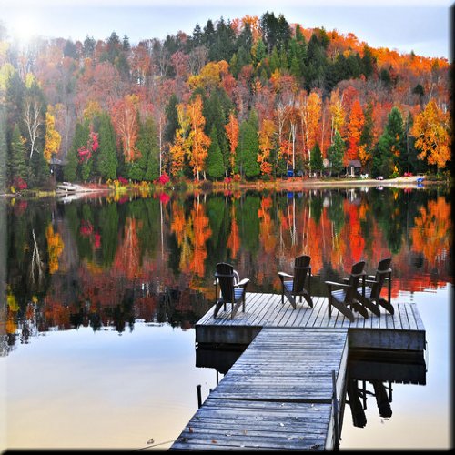 Rikki Knight RK-8intilec-8962 8" X 8" Wooden Adirondack Chairs on Dock on Autumn Lake Design Ceramic Art Tile