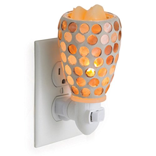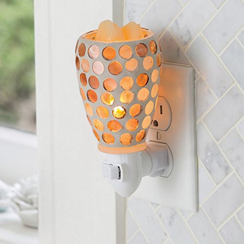 Pluggable Fragrance Warmers are decorative and versatile. It can be used with any outlet both vertical and horizontal by twisting the base. It is ideal for above the counter outlets in small rooms and spaces. Glowing light shines through circles of mother-of-pearl colored glass with this pluggable warmer. An attached clear glass dish holds wax melts. Includes a warming bulb.