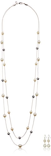 -. Title : Silver Tone Two Row Simulated Cream Pearl Illusion Necklace and Earring Jewelry Set, 36"