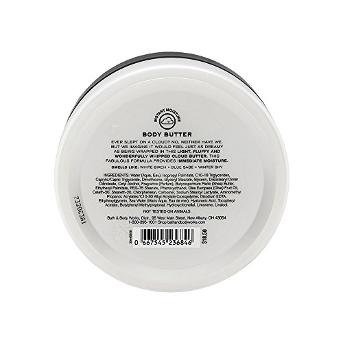 -. Binding : Misc. -. Brand : Bath & Body Works -. EAN : 0756134094063 -. Feature : A soft, dreamy blend of white birch, blue sage & winter sky / This fabulous formula provides immediate moisture. -. IsAdultProduct : 0 -. Label : White Barn -. Manufacturer : White Barn -. MPN : none -. PartNumber : none -. ProductGroup : Beauty -. ProductTypeName : BEAUTY -. Publisher : White Barn -. Size : 7 Ounces -. Studio : White Barn -. Title : Bath and Body Works Electric Blue Sky Cloud Butter 7oz -. UPC : 756134094063