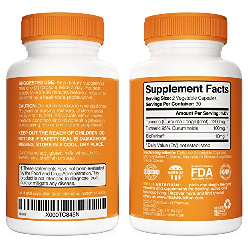 -. Binding : Health and Beauty -. Brand : THIS IS NUTRITION -. EAN : 0646437299466 -. Feature : POTENT: 1300mg per serving with 95% curcuminoids: potent and at the best value for your money! / BIOPERINE ®: a black pepper extract, is proven in clinical tests to increase absorption of Turmeric / LIFE LONGEVITY: Seen to help arthritis, depression, blood pressure, memory, immune system & digestion. / GIMMICK FREE: No fillers, no 'extras', clear labeling, vegan friendly - the perfect addition to your diet. / LIFETIME GUARANTEE: 100% of your money back if you aren't satisfied. Simple. No hard feelings. -. IsAdultProduct : 0 -. Label : This Is Nutrition -. LegalDisclaimer : † These statements have not been evaluated by the Food and Drug Administration. This product is not intended to diagnose, treat, cure or mitigate any disease. -. Manufacturer : This Is Nutrition -. MPN : TIN001 -. PartNumber : TIN001 -. ProductGroup : Health and Beauty -. ProductTypeName : HEALTH_PERSONAL_CARE -. Publisher : This Is Nutrition -. Studio : This Is Nutrition -. Title : Turmeric Curcumin With Bioperine ® and 95 % Curcuminoids - Powerful All Natural Supplement By This Is Nutrition - Anti-Inflammatory - Antioxidant - Immune Booster - Digestive Aid & More - With Black Pepper For Incredible Absorption -. UPC : 646437299466