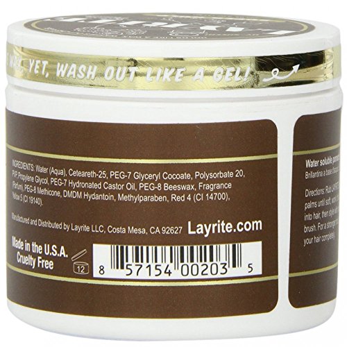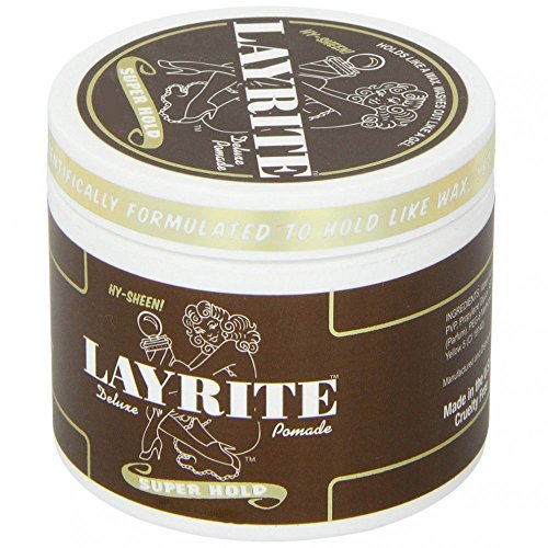 About the product: Developed to replace the wax that greasers would use in the SoCal rockabilly scene, water-based Layrite pomade holds like a wax, but washes out like a gel! What other pomades call extreme hold, we just call original. The same formula greasers have been trusting for 10 years. - Holds as strong as a wax- High shine for that polished look- Water-based formula washes right out just like a gel- No drying formula keeps hair soft with no flaking- Controls even the curliest and thickest hair out there- Keeps your hair in place and looking good all dayHow to use it:Because it is water-based, Layrite pomade is versatile - you control the strength of hold and sheen simply by drying your hair to the desired amount: - Dry your hair: Layrite Pomade is has the strongest hold when used on DRY HAIR. Blow your hair completely dry for hold like a 90 weight wax or towel dry your hair for hold like a 30 weight wax.- Apply Layrite: Rub an ample of Layrite into the palms of your hands until it softens, then rub thoroughly into your hair.- Style: Simply comb or brush into desired hairstyle. Add more Layrite or more water as needed to achieve the style you want. - - Layrite does not dry in your hair so you can re-style as need throughout the day without losing any control.