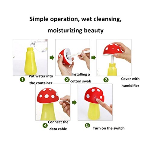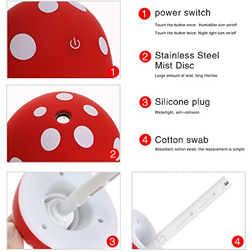New Design: Mini cute cool mist mushroom air humidifier diffuser, fight back against dry air. Keep the cotton swab wet before use, take it out when it is not in use.