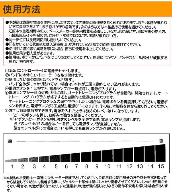 EMS(ElectricalMuscleStimulation)で1分間にMAX1000回筋肉を刺激。約23分間のオートトレーニングプログラムでテレビを見ながら、ゲームをしながら、お友達とおしゃべりしながらでもご使用いただけます!!ボタン一つで簡単に操作でき、コードレスだから邪魔にもなりません!!また、15段階刺激調整で運動効果に合わせた設定が可能となっております。 |