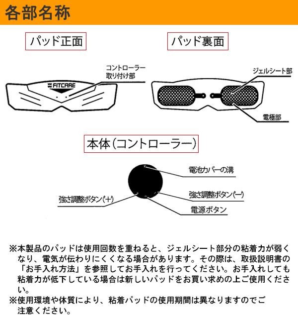 | 仕様 | 周波数:25Hz±10%低周波 強さ調整:15段階 使用電源:コイン型リチウム電池CR2032×1個使用 パッド使用期間目安:約1ヶ月(1日1回23分間使用する場合) |