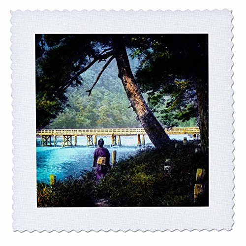3dRose Vintage Japanese Geisha in Kyoto Looking Out Over the Moon Bridge Quilt Square, 8 x 8"