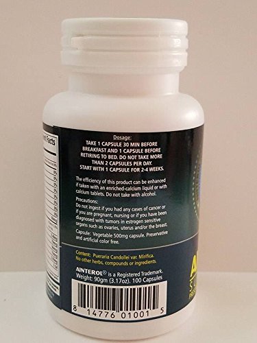 -. Binding : Health and Beauty -. Brand : Ainterol -. EAN : 7290012364587 -. Feature : promotoes women's health / 100 % Natural -. IsAdultProduct : 0 -. Label : Ainterol -. LegalDisclaimer : PMC does not stop the spread of HIV or other sexually transmitted diseases (STDs) to others through sexual contact. Use barrier methods of birth control (e.g. condoms) if you have HIV infection or an STD. PMC will not prevent pregnancy. If your partner can become pregnant and you wish to avoid pregnancy, be sure to use an effective form of birth control. PMC is known not to interfere birth control pills. However, make your own observations or consult your doctor. PMC is not recommended for use in children and minors. -. Manufacturer : Ainterol -. MPN : 814776010015 -. PackageQuantity : 1 -. PartNumber : 814776010015 -. ProductGroup : Health and Beauty -. ProductTypeName : HEALTH_PERSONAL_CARE -. Publisher : Ainterol -. Studio : Ainterol -. Title : Ainterol Pueraria Mirifica 500mg Pure-D R1 Capsules 100% New Stronger Strain - Grown in Thailand