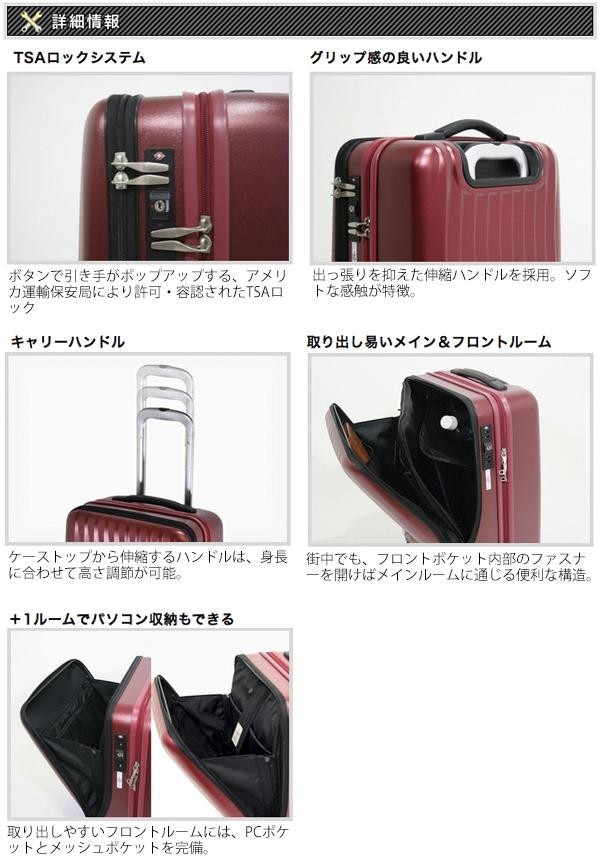 | 仕様 | 機内持込可能サイズ 伸縮ハンドル長さ4段階調節可 容量:34L |