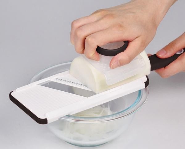 すべり止め機能付きで材料がぶれず、スムーズに千切りができるガード付き。