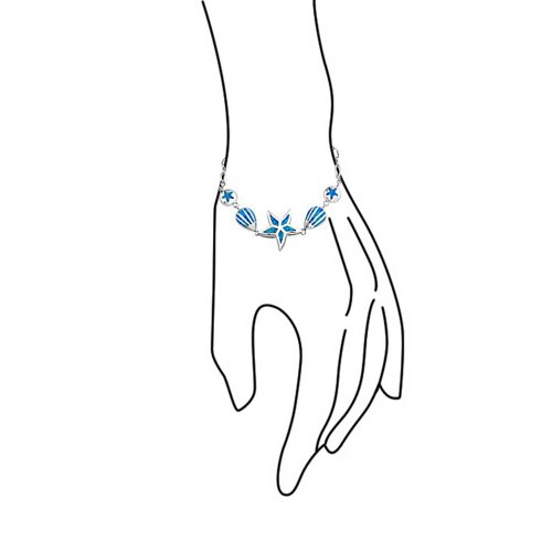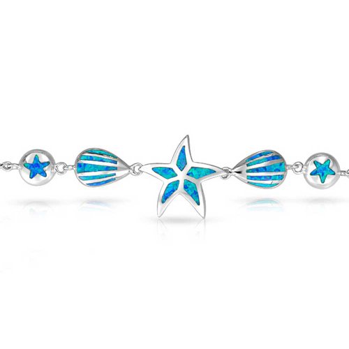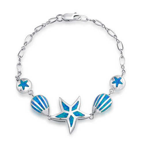 Spend a day by the sea with this nautical jewelry. A center starfish is filled with a Synthetic Blue Opal inlay and flanked by two seashells and sand dollars. Easy and breezy, this sterling silver bracelet is perfect for anyone who loves the beach and sea creatures. Whether you are taking a trip to Hawaii or want to reminisce about a past trip, this Synthetic Blue Opal jewelry will have you dreaming of the sea. A lobster claw clasp keeps it securely in place and the sterling silver composition is sure to last for years. Starfish jewelry is perfect for summer but will also add a fun pop of color in colder months. Shop it today at an extraordinary price.Feature