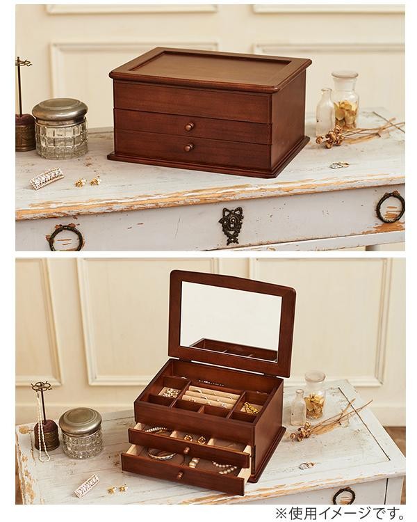 | 日本の職人さんがひとつひとつ丁寧に作った、長く愛用できる木目の美しいジュエルケースです。様々なアクセサリーを収納できる充実した収納スペース、底部はベージュの布張りで高級感があります。フタ裏にはコーディネートに便利な大きなミラーが付いています。 |