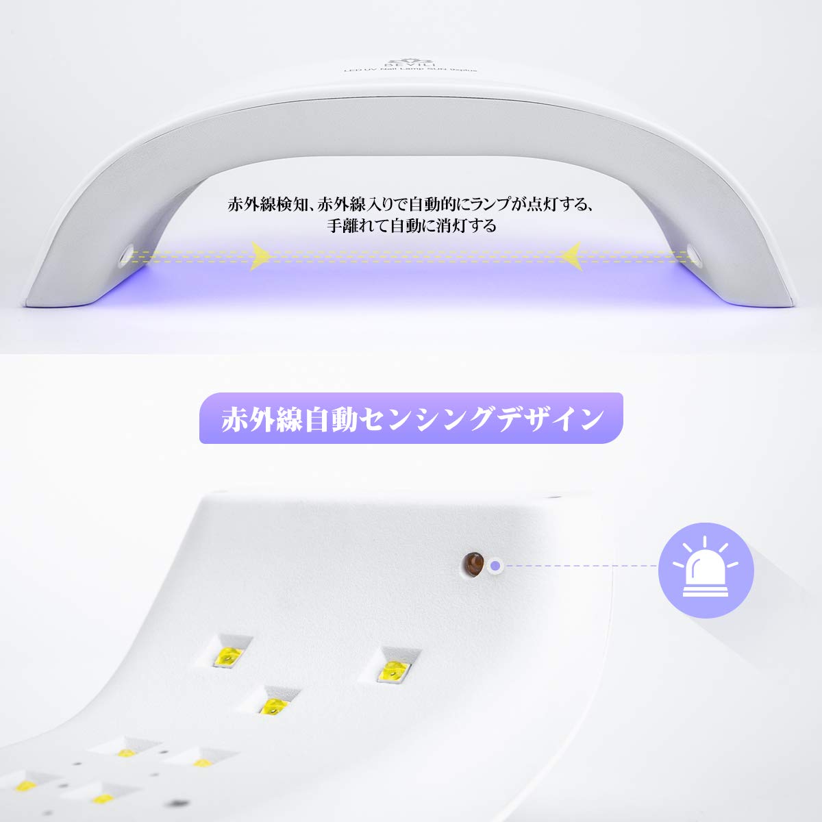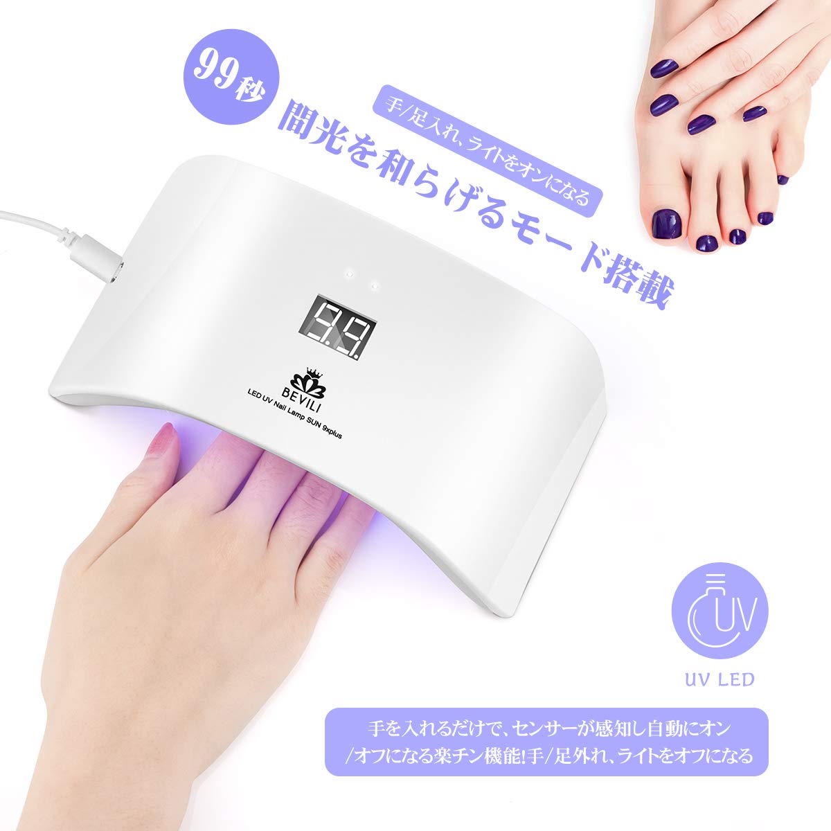 赤外線検知で自動センサー:赤外線検知システム搭載するので、手や足を入れると、自動的に硬化ライトが点灯、手を出したら自動消灯するのでとっても便利です!99秒無痛モードはお客様に心地良いエクステンションジェル体験をご提供します。