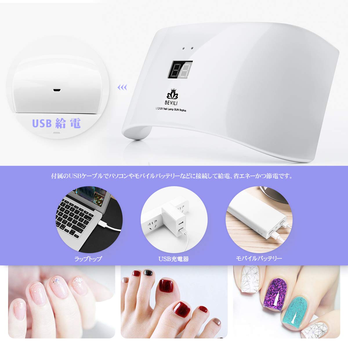 USBポート接続:USB給電式ネイルドライヤーなので、USBケーブルでパソコンやモバイルバッテリーなどに接続して給電でき、いつでもどこでも簡単に使えます。