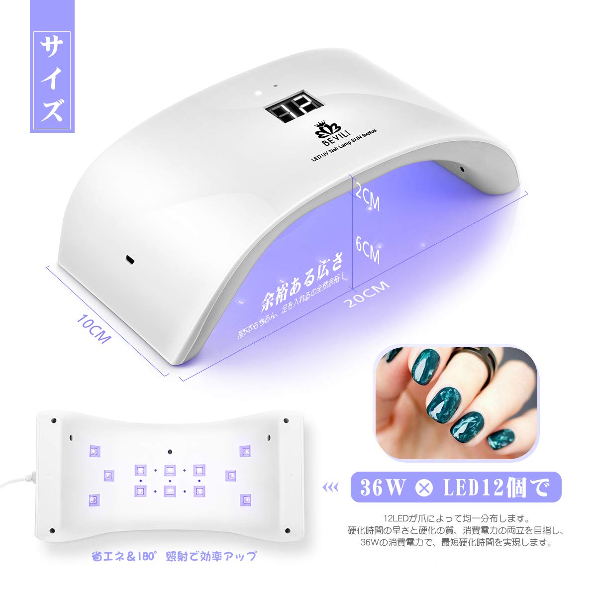 180度照射:36WのUV/LEDを12個使用して、180度の方向から指の爪のすべての範囲をカバーし、ジェンルポリッシュを迅速かつ徹底的に乾燥できます。