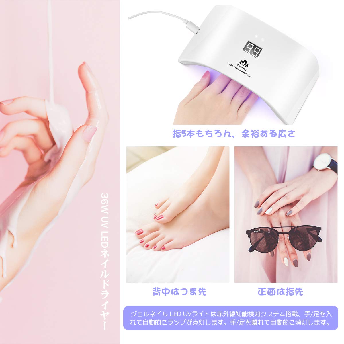 持ち運びが簡単、使いやすい:手ごろな中型デザインで、持ち運びも簡単です。5本の手や足の指を同時に硬化できます。電源を入れるだけでネイルが始まります!やさしい光源で爪、肌、目にもとてもやさしい仕様となっています。