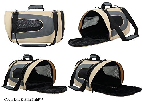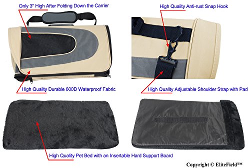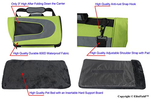 -. Feature : Size: 18"L x 10"W x 11"H. Airline approved pet carrier with comfortable padding inside for cats, small dogs, and other small pets. Measure your pet's height and width P.R.Ior to selecting a carrier to ensure correct fit. Check your airline rules and regulations P.R.Ior to flying. / Special Features: A removable and washable plush soft bed cover with an insertable hard support board keeps the carrier in good shape and makes your pet feel more comfortable. (Note: comparable pet carriers from other sellers do not include pet beds). 600D fabric combined with inside padding make the carrier sturdy and hold it in good shape to keep your pet safe. A built-in leash allows your pet to be secured to the carrier. / Made from durable, lightweight, waterproof material. Easy to clean. The front and sides are made of mesh netting for added sunlight and breathability. Compared to other brand pet carriers with similar design, this pet carrier is made of higher quality materials, and thus the pet carrier is more durable and is more comfortable for your pet. / A pocket for accessory storage. Carrying handle and adjustable padded shoulder strap allow for more carrying options. The adjustable shoulder strap also allows the carrier to be restrained with a seat headrest for car travel. Only 3" high after folding down the carrier for easy storage. / 3 Year Warranty from EliteField, a New York-based Pet Product Manufacturer. Product Quality Guarantee, 100% Money-Back Guarantee, Customer Satisfaction Guarantee. (See important information in "Product Description" section below).