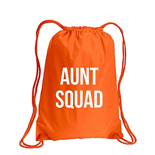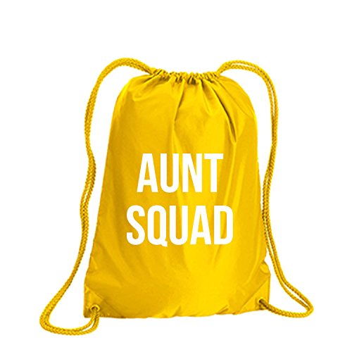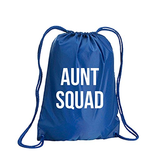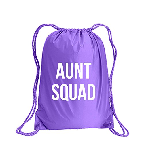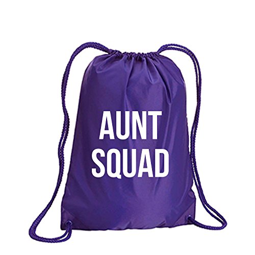 Product Description This durable and stylish nylon tote features "Aunt Squad" on a cinch pack tote with white ink. Bag comes in small and large sizes and is made of a durable 210 Denier nylon and has color-matched draw cords. Printed in the USA on an imported bag. 0