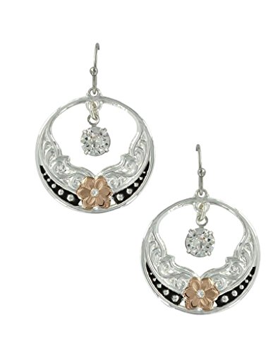 A striking circular jewelry set of silver and rose gold finishes. The circular pendant has an irregular center open shape framing a brilliant round clear Swarovski Zirconia, that dangles from the top of the circle. The lower part of the circle has a bottom center rose gold finished flower design, like a wild rose. Silver finished flowing scrollwork runs up the sides of the circle like small scalloped wings on the flower. A lower design of graduating sized silver finished pin points shines against a hand-painted black background runs underneath the 'wings'. Earrings dangle from hypoallergenic French hooks.Feature