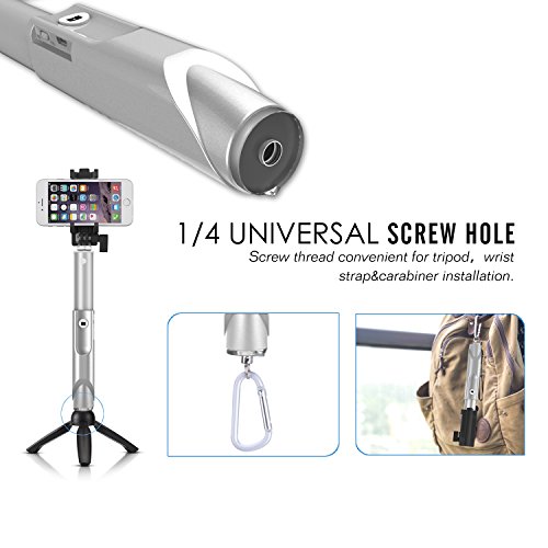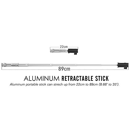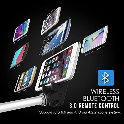 - Feature : Compatible with IOS 6.0 / Android 4.2.2 or Above System (no app needed), if the Android system is lower than Android 4.2.2, then simply download the free app "Camera360" from Google Play. / Turn on the power button of the selfie stick, pair it with your phone via Bluetooth, and take photos with the accessible white handle button, one-hand manipulation. / Small and portable one-piece foldable design, no installation needed. Comes with a carabiner and a hand strap for convenient carrying. Compaptible with Gopro with inbuilt housing. / The stick is made of aluminum, it is lightweight, rustproof, durable and easy to use. The handle is made of ABS material, it effectively prevents slipping and has a comfortable touch. / 5-grade foldable design, extendable from 22cm to 83cm (8.66" to 32.67"), rotate the stick clockwise to lock the length and rotate the stick anticlockwise to adjust length. Suitable for phones with a width between 45 - 90mm (1.8"-3.5").