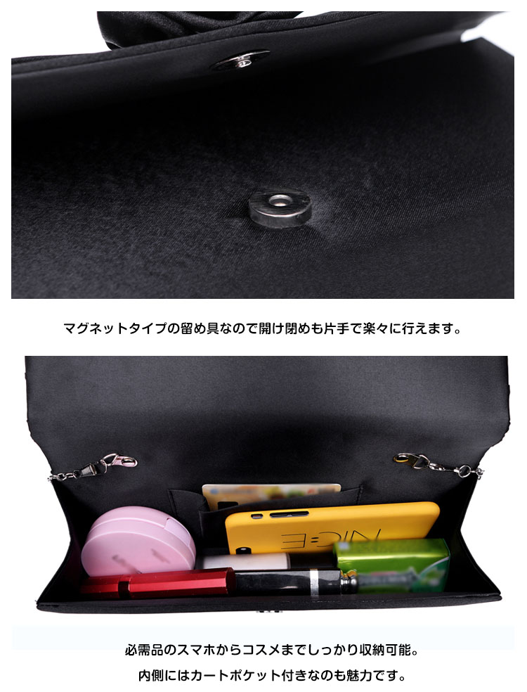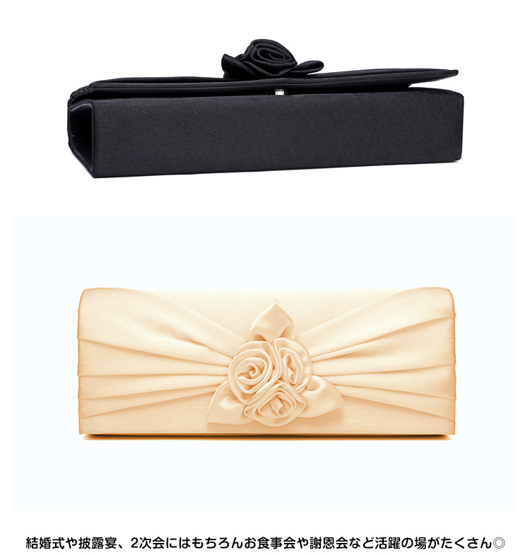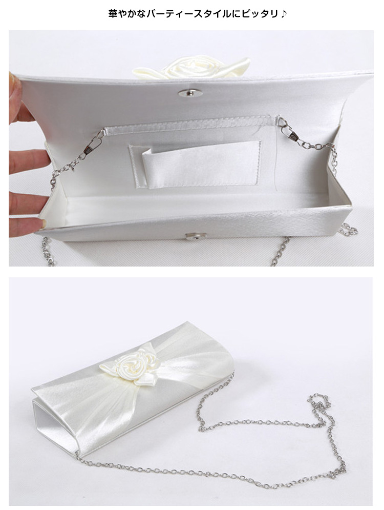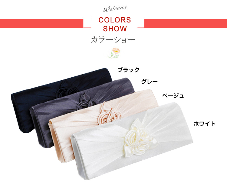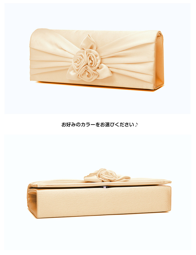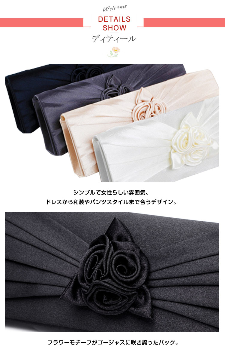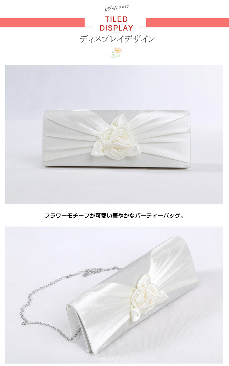 | フラワーモチーフが可愛い華やかなパーティーバッグ。華やかなパーティースタイルにピッタリ♪サテン生地の光沢感が上品さも醸し出します。結婚式や披露宴、2次会にはもちろんお食事会や謝恩会など活躍の場がたくさん◎お好みのカラーをお選びください♪ | |