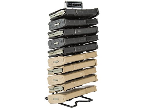 The Lockdown Magazine Rack is ideal for keeping AR-15 magazines organized. It conveniently holds up to 10 magazines loaded or unloaded. It is designed to stand upright on a shelf or any flat surface and can be easily mounted to a wall or vault door. It is compatible with both mil-spec and polymer mages. Holds any in-line magazine from 10 to 30 rounds. The vinyl coated steel structure is durable and won't scratch or mar surface finishes.Feature