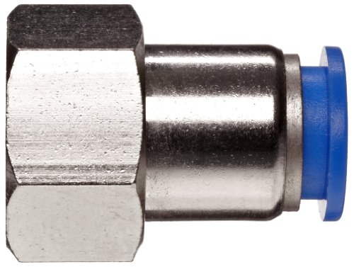- Push-to-connect fitting connects to pipes or tubing on one end and has an NPT female connector on the other
