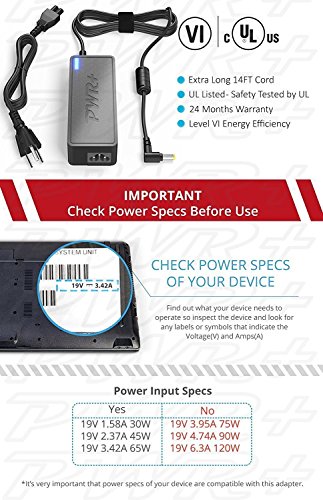 POWER SPECS : Output Max: 19V 3.42A 65W (45W compatible) / Input Volt Range: 110-240V / Original Toshiba Charger Laptop AC Adapter Power Cord Replacement by PWR+