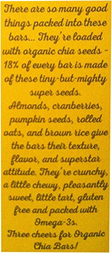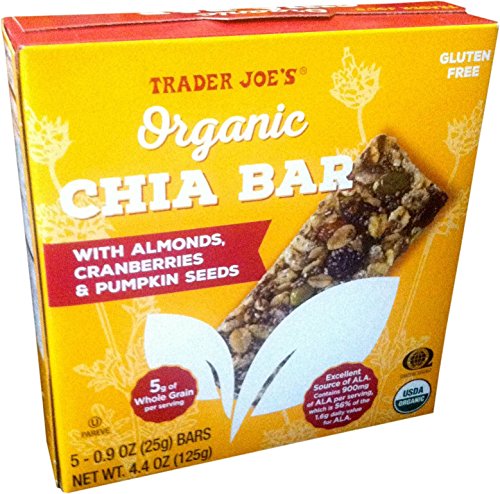 -. Feature : Trader Joe's Organic Chia Bars with Almonds, Cranberries, & Pumpkin Seeds - 4.4oz (125g) / Each bar is 18% organic chia seeds. That's a lot of chia. Pressed with organic rolled oats, organic almonds, organic sweetened cranberries, organic pumpkin seeds, and organic brown rice; each bar is dense with delicious nutrients-including 5 grams of whole grains and 900 milligrams (56% of the daily value) of the antioxidant ALA (alpha-lipoic acid). / Equally intriguing is what each bar is light on or lacking-calories (just 100), sugar (only 4 grams), sodium (only 50 grams), dairy (none), and gluten (none). / These few-bite-sized bars are sink-your-teeth-in dense and a little crunchy. The richness of the whole seeds, nuts, and grains are offset by brown rice and agave syrup sweetness and dried cranberry tartness. They deliver a simply satisfying snacking experience. / Trader Joe's brand products contain NO synthetic colors, artificial flavors, artificial preservatives, MSG, added trans fats, dairy ingredients from rBST sources or genetically modified ingredients.