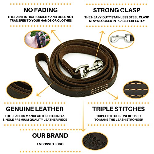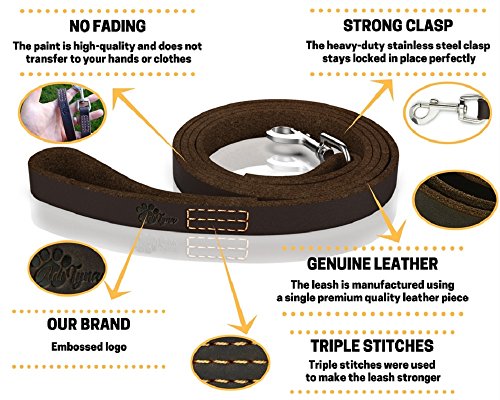 - MADE TO LAST: The 6 foot dog leash leather is carefully manufactured using a single long leather piece. It is also a little stretchy to avoid cracks over time. The paint is high-quality and does not transfer to your hands or clothes.