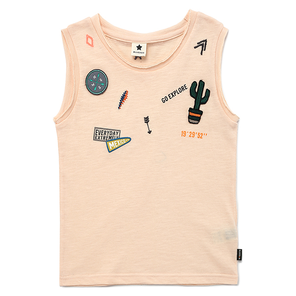 넥과 소매에 데끼처리를 주어 캐주얼한 느낌과 함께 다양한 그래픽과 와펜츠로 포인트가 있는 나시티입니다.