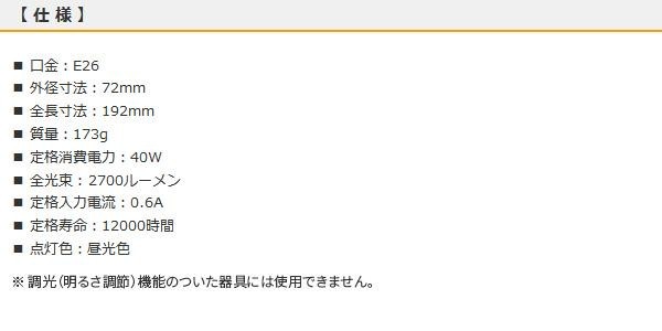 fk094igrjs照明器具の適合ランプ表示で白熱電球200W形となっている器具でご使用になれます光色は昼光色で屋内専用です サイズ 個装サイズ:9×22×9cm 重量 個装重量:190g 仕様 取扱説明書(パッケージ記載) 生産国 中国 消費電力40Wで白熱電球200W相当の明るさ 照明器具の適合ランプ表示で白熱電球200W形となっている器具でご使用になれます光色は昼光色で屋内専用です