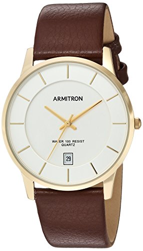Brand, Seller, or Collection Name:Armitron Model number:20/5190SVGPBN Part Number:20/5190SVGPBN Item Shape:Round Dial window material type:Mineral Display Type:Analog Clasp:Buckle Case material:Metal Case diameter:38.5 millimeters Case Thickness:7.5 millimeters Band Material:leather calfskin Band length:Men's Standard Band width:0.79 inches Band Color:Brown Dial color:Silver Bezel material:Metal Bezel function:Stationary Calendar:Date Item weight:4.80 Ounces Movement:Japanese quartz Water resistant depth:100 Feet