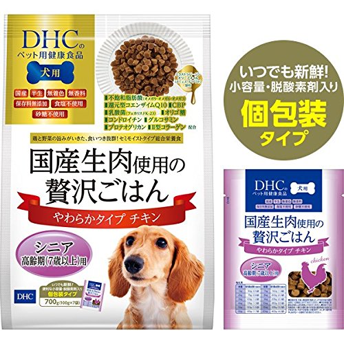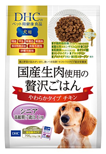 原材料:肉類(鶏肉、鶏胸肉、鶏レバー)、小麦粉、大豆たんぱく、野菜類(キャベツ、大麦若葉、さつまいも、ケール、ほうれん草、カボチャ)、精製魚油、卵黄油、オリーブオイル、昆布、N-アセチルグルコサミン(かに由来)、コンドロイチン蛋白複合体(ムコ多糖タンパク)、月見草油、ユビキノール(還元型コエンザイムQ10)、オリゴ糖、乳酸菌(フェカリス菌)、濃縮乳清活性たんぱく(乳由来)、サケ鼻軟骨抽出物(デキストリン、サケ鼻軟骨エキス)、ソルビトール、グリセリン、ベーキングパウダー、ミネラル類(炭酸カルシウム、リン酸塩、グルコン酸亜鉛、クエン酸鉄、銅酵母)、ビタミン類(A、D、E、B1、B2、ナイアシン、B6、葉酸、B12、パントテン酸、C)