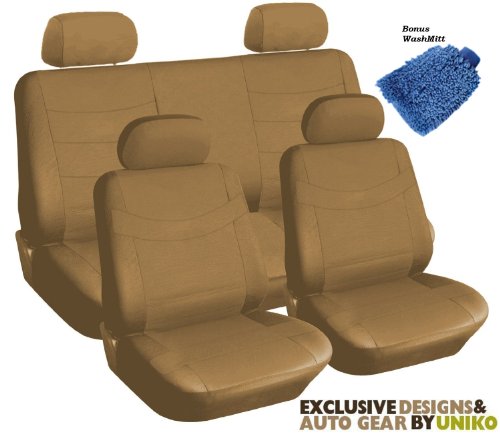 Complete with 4 headrests, two front bucket seat covers, bench cover, steering wheel and seat belt covers. Made by Unique Imports