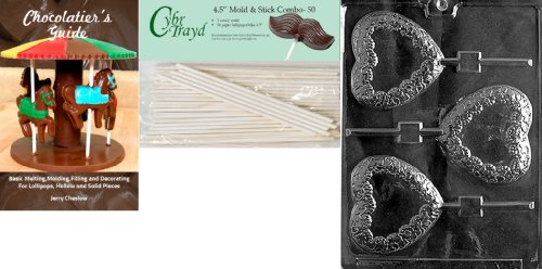 Cybrtrayd 'Heart with Flowers Lolly' Valentine Chocolate Candy Mold with 50 4.5-Inch Lollipop Sticks and Chocolatier's Guide