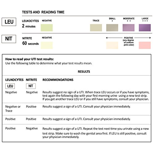 Symptoms of UTIs: ? A burning feeling when you urinate ? A frequent or intense urge to urinate, even though little comes out when you do ? Pain or pressure in your back or lower abdomen ? Cloudy, dark, bloody, or strange-smelling urine ? Feeling tired or shaky ? Fever or chills (a sign the infection may have reached your kidneys). Fast facts on urinary tract infections: ? Women have a lifetime risk of over 50% of developing a urinary tract infection ? Urinary tract infection is usually diagnosed based on symptoms and testing of a urine sample ? Uncomplicated urinary tract infections can be cured with 2-3 days of treatment ? Cranberry extracts do not treat UTIs but may help reduce the risk of recurrent UTI. Easy To Use: Just dip the test into urine and read results. Compare the color change of the pads to the color chart on the bottle label. 0