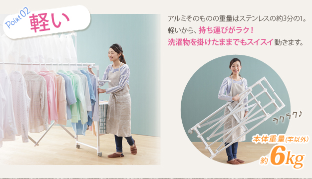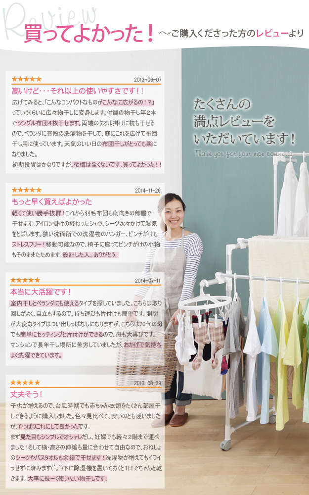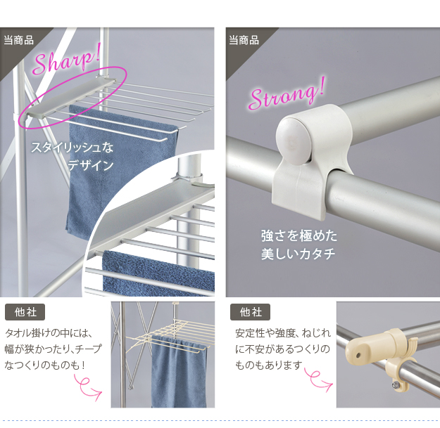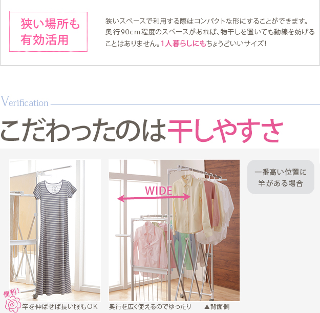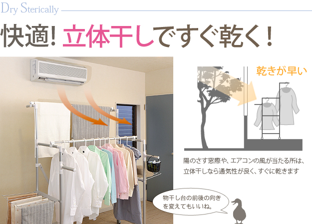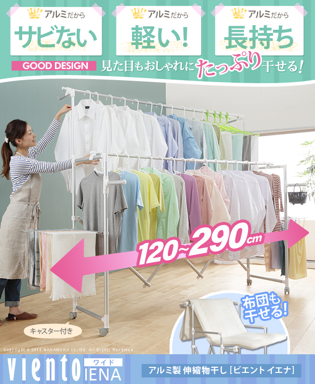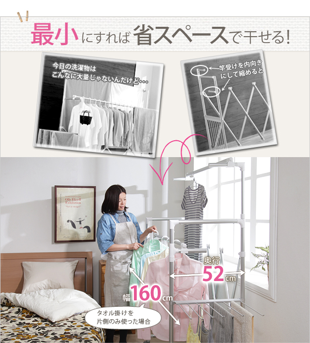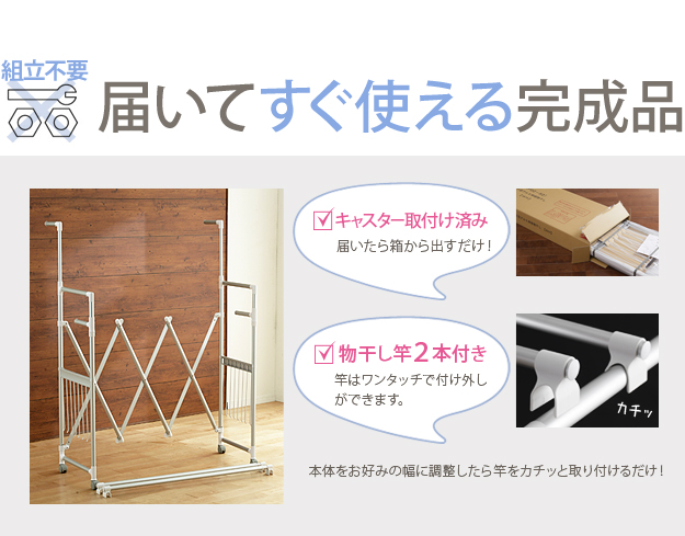 ●商品について:場所や洗濯物の量に合わせて幅も高さも伸縮自在!スペースを無駄なく活用できる室内物干し。大きな洗濯物までしっかり干せて花粉や梅雨の季節も安心☆竿(別売)を追加すれば布団を立体的に干せます。キャスター付きですので収納や移動もラクラク♪
