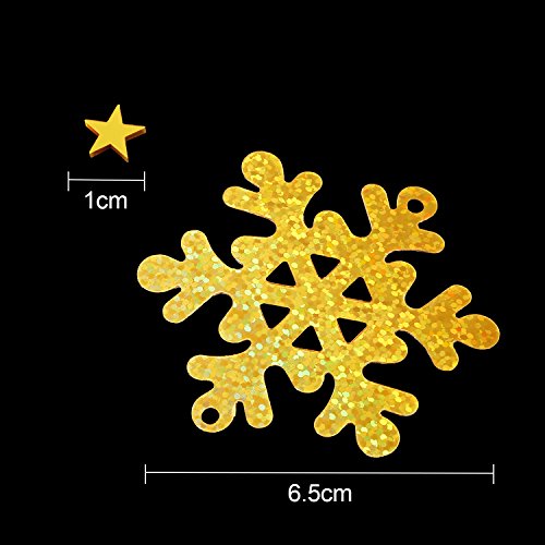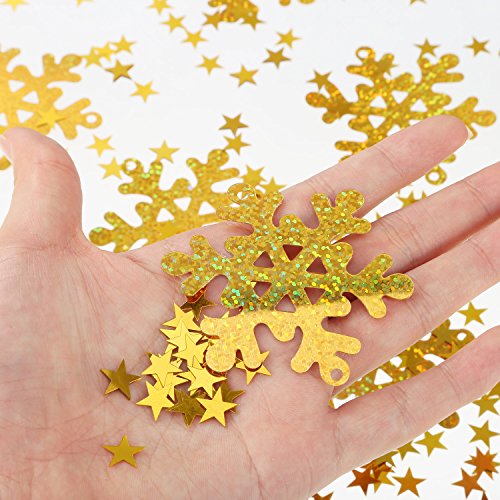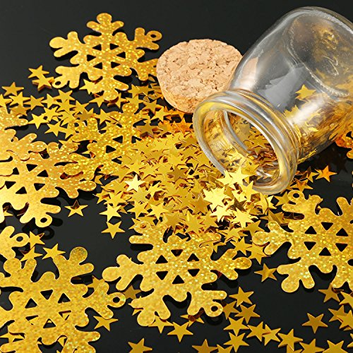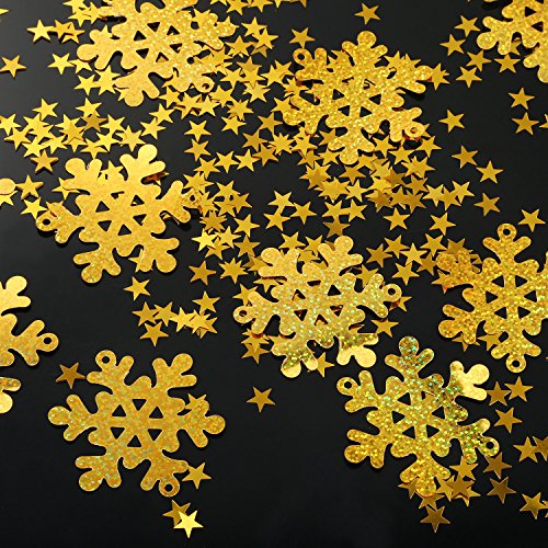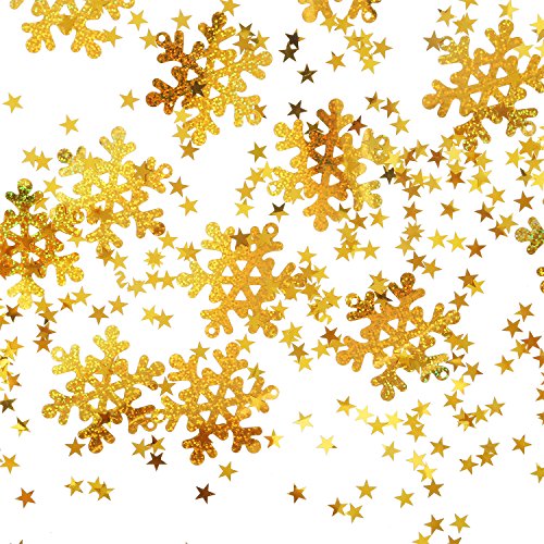Enough quantity: The Christmas theme table confetti contains 30 g/ 48 pieces gold snowflake confetti and 30 g/ 2000 pieces gold star confetti, good for serving as party supplies, enough to meet your different needs. Easy to use: These confetti are made of PVC material with smooth and bling surface, you can use them to decorate your party tables, they also can function as embellishments for invitations, cards, scrapbooks, DIY craft, favor bags, gift basket, and more. Wide application: These snowflake and star confetti are good for applying at many kinds of parties such as Christmas parties, wedding parties, birthday parties and other themed parties. Wonderful accessories: With exquisite workmanship and shiny color, these confetti can be applied to add joy and cheer to your Christmas party, wedding party and other festive occasions, providing a special visual enjoyment. Specification: Snowflake confetti size: approx. 6.5 cm in diameter Star confetti size: approx. 1 cm in diameter Material: PVC Color: gold Weight: 30 g (approx. 48 pieces) gold snowflake confetti and 30 g (approx. 2000 pieces) gold star confetti Note: These confetti are small items, not suitable for children under 3 years old, adult supervision required. Package contents: 30 g Snowflake confetti 30 g Star confetti 0
