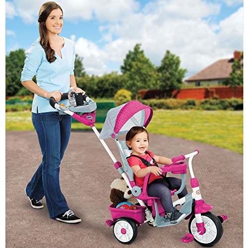 The Perfect Fit 4-in-1 Trike is ready to grow with your child! With all of the features of your favorite stroller, this trike is not only a perfect fit for your child – it's a "perfect fit" for parents too! This advanced trike makes on-the-go travel easy with multiple storage spots! From parents pushing, to toddlers learning to pedal, to them starting to steer, and then going on their own, this trike keeps pace with your active, growing child. Stage 1-Stroll (9+ months) Parents to push and control-When the foot platform is installed, the child will be unable to reach the pedals Stage 2-Pedal (18+ months) Toddlers can learn how to pedal, child is unable to turn the wheel Stage 3-Learn (24+ months) Remove the waist bar, child can steer while parent still has control with the push bar Stage 4-Trike (30+ months) Remove the push bar to let kids go on their own with parent supervision Product Features: • Pink 4-in-1 trike to grow with your child from stroller to trike • Full shade canopy to protect child from all angles • High-back seat for comfort and safety • Adjustable seat with the flip of a switch • Full foot platform fully protects little feet • Large parent storage bucket and bottle holder • Safety-bar with cup/snack holder • Ages: 9+ monthsFeature