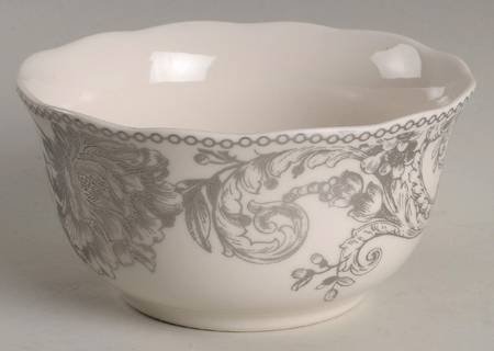Set of 4 ivory soup/cereal bowls with platinum floral and birds design; scalloped rim