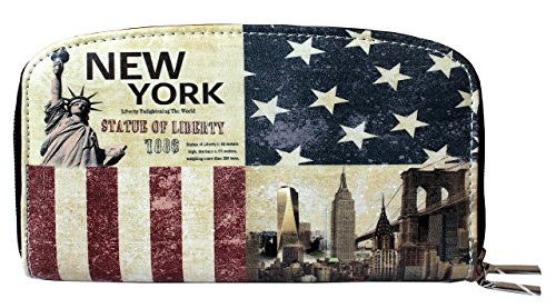 -. Title : Vintage USA Flag New York Statue Liberty Double Zip Big Wallet Blue White Red
