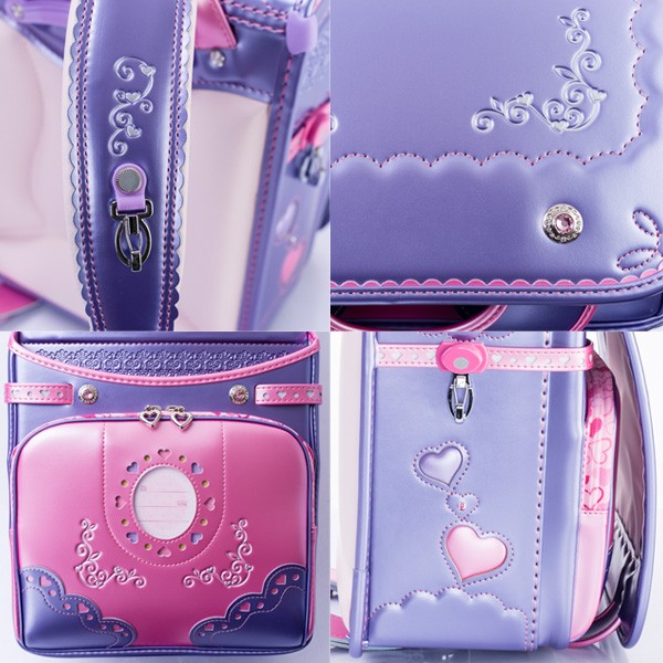 内装:ピンクドット、錠前:ワンタッチロック、補強:ガッチリガード、ポケット:ワイドポケット・内装総内張り・小ナスカン付、肩ベルト:ふわりぃ仕様・長尺・9穴・フリル型・箔押し・右(ハートカン)・左(小ナスカン)、鋲:クリスタルサークル、ナスカン:反射材付、冠裏:レース&ドット、反射材:冠下部・前締め・肩ベルト、固定型持ち手、カラー:パールラベンダー×パールピーチ