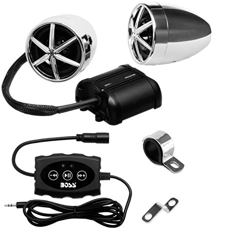 Take your music off-road or on the road for your next big adventure with the Boss Audio MC600B Chrome Weatherproof Motorcycle Sound System. Great for 12V Motorcycles, Scooters and ATV's, you can blast out your tunes with the 800 Watt Max Power Amp and one pair of 3" Full Range Speakers. Hook your smartphone or MP3 player up to the Auxiliary Input. Bluetooth Audio Stream and Control lets you play and control your favorite music apps like Spotify and Pandora. Control the play/pause, track and volume with the Bluetooth Inline Multifunction Remote. The MC600B features a Weatherproof Amp and Speakers to provide protection against the elements. Ride in style with the Boss Audio MC600B.Feature