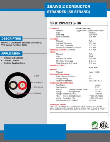 -. Feature : 16 AWG 2 Conductor Audio Cable / Stranded (65 Strands) Oxygen Free Copper Conductors / PVC Jacket / CMR/CL3 Rated / Rip Cord