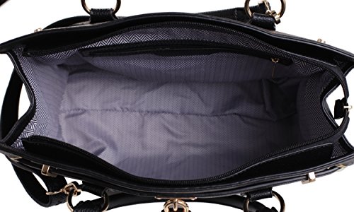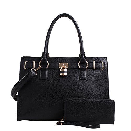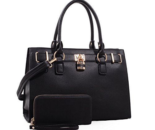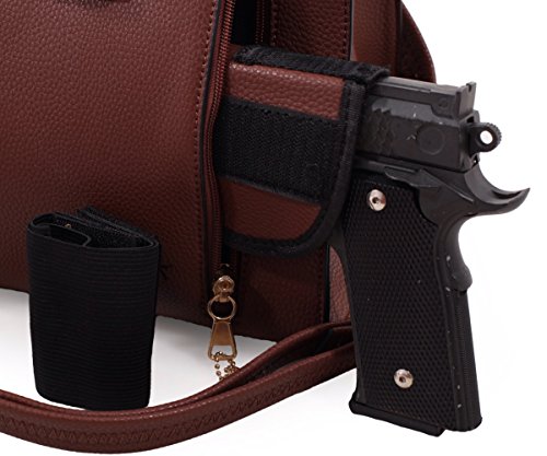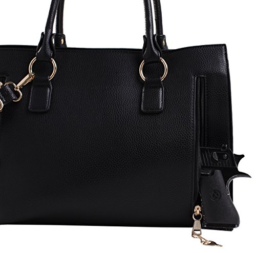 Product Description Matching Wallet included 8"L X 1"W X 3.5"H Dual top carry handles and zipper enclosure Separately concealed compartment on back with 2-zipper-openings for both right and left hand side carriers. New Lock and Key feature for safe and secure weapon storage. Detachable and adjustable shoulder strap. Interior zipper pocket and slip cell phone pockets. Removable holster included Handbag Dimensions: 15"L X 6"W X 11.5"H Concealed pocket measurement: 11"W X 7.5"H Made with Faux Leather 0
