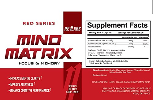 Studio : RevLabs Publisher : RevLabs Binding : Health and Beauty Product Description Mind Matrix uses the unique properties of several high grade nootropics with amino acids which increase alertness, support attention, and may reduce mental errors. A mild stimulant effect helps to keep drowsiness to a minimum, while other ingredients work to optimize your alerts so that you can get the most out of work, athletics, or any activity that demands high levels of concentration. Each ingredient has a powerful cognitive effect that works in trade with the next ingredient to maximize the effectiveness of the supplement as a whole. This is a lifestyle supplement designed to make you better in and out of the gym. Experience MIND MATRIX. Be your BEST SELF! About RevLabs- Every RevLabs formulation incorporates only the finest, scientifically validated ingredients, in fully effective doses. No exceptions. It's a revolutionary approach to supplement development; formulations engineered to work. Revlabs rapid growth (over doubling in size every year since inception) is a testament not just to the quality of our formulations, but the experience and empowerment that comes along with connecting yourself to our brand. Whether your fitness goals are to compete for the UFC championship belt or you are just a weekend warrior wanting to look and feel better we identify the nutritional hurtles standing in your way and empower you to over come them. When you become a part of the RevLabs family whether it be as a retailer, customer, sponsored athlete or employee, you are joining a an elite movement empowered by a willingness to help you elevate. Our wealth of online fitness resources, superior products, excellent customer and retailer support make us an asset to those looking to perform their best in fitness and in life. With your passion and our powerful support, the potential is limitless. RevLabs: Empowering Your Performance 0