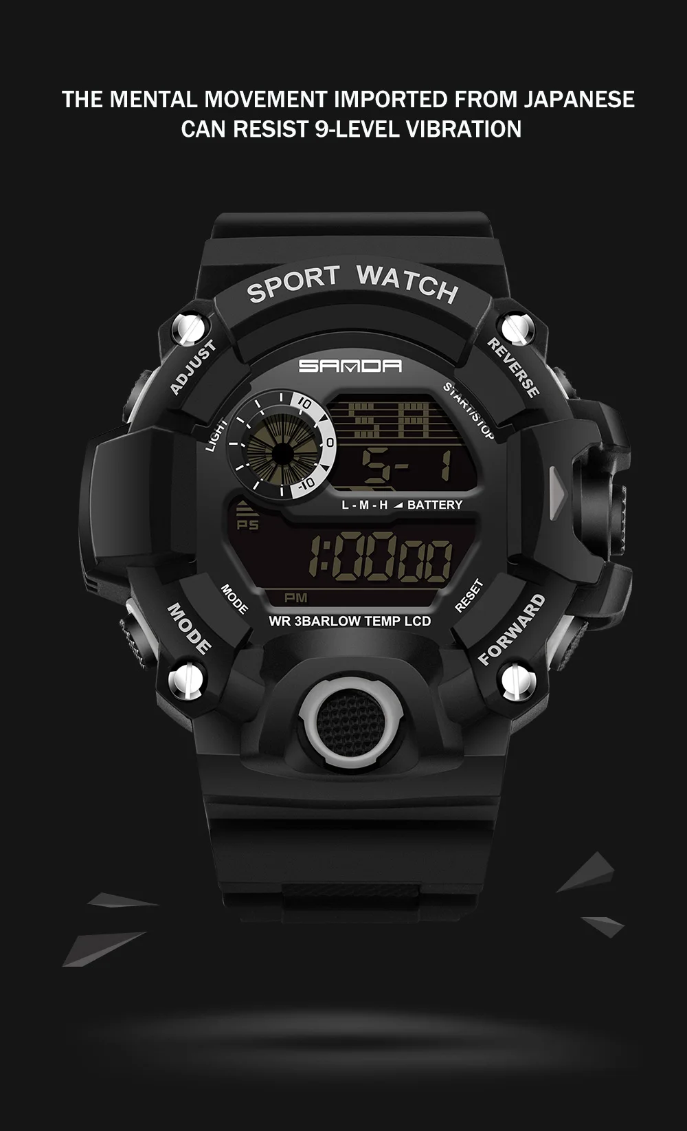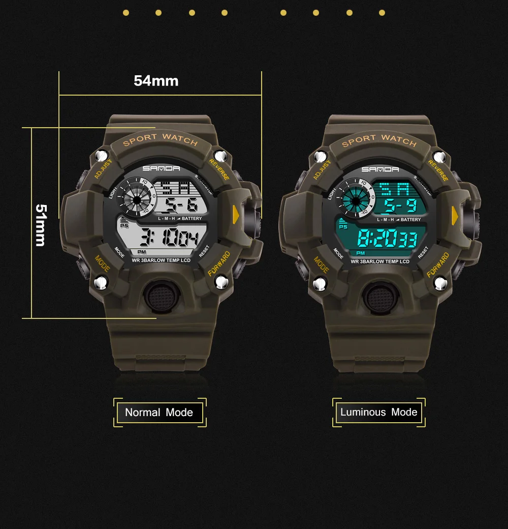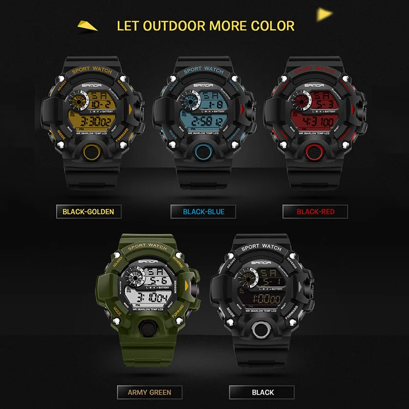Feature:Water Resistant,LED display,Stop Watch,Back Light,Complete Calendar,Shock Resistant,Chronograph,Auto Date,Alarm,Swim